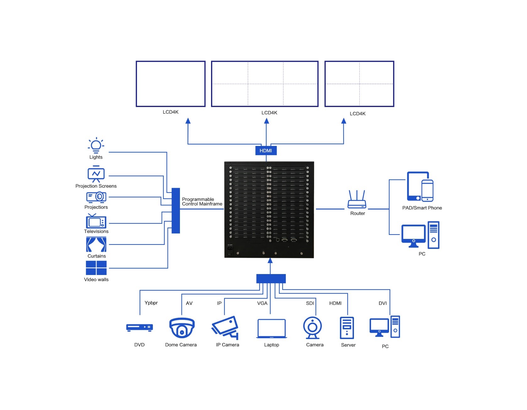 ✦支持触摸屏,RS232串口,网络,中控,移动端或PC端WEB进行控制。