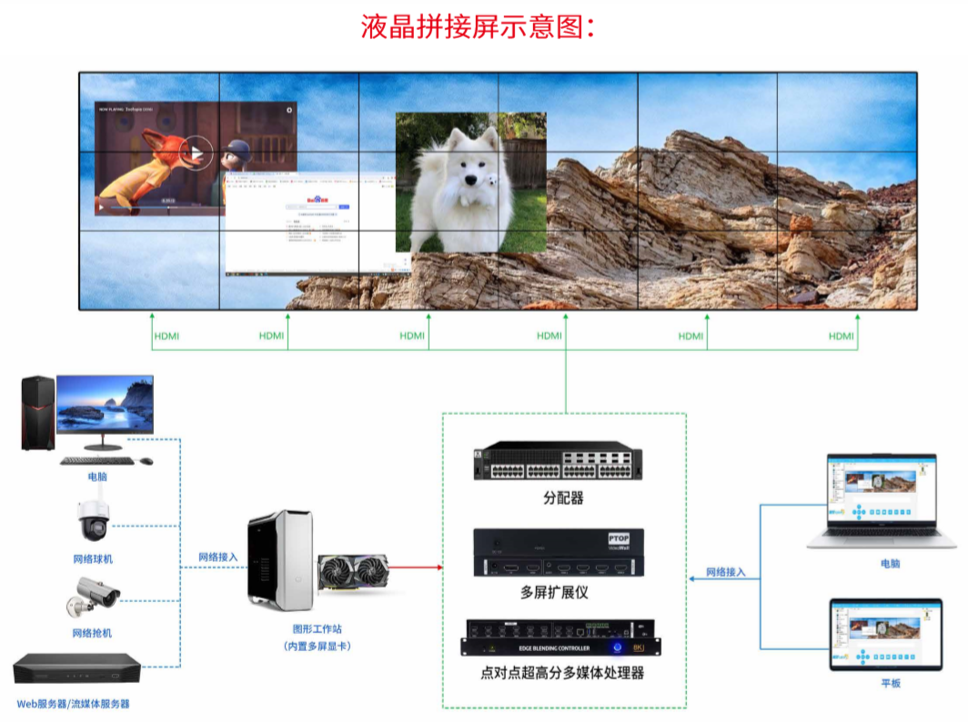 ✦每套拼接墙对应一个超高分桌面/电脑,可以通过一个客户端(PC/平板) 对局域网内多台主机统一管理和集中 控制,简单高效。