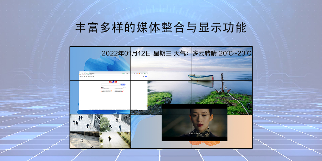 6.丰富多样的媒体整合与显示功能。除4K HDMI采集外,还能够整合音视频文件、图片、web网页等各种媒体,在拼接屏上按照预设的布局进行展示。同时还能融合天气预报、时钟信息、飞行字幕等日常信息的显示。