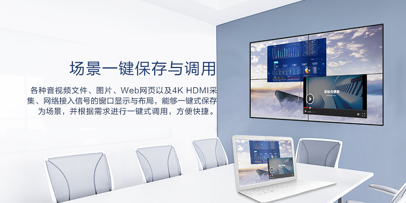 9.场景保存与调用。各种音视频文件、图片、Web网页以及4K HDMI采集、网络接入信号的窗口显示与布局,能够一键式保存为场景,并根据需求进行一键式调用,方便快捷。